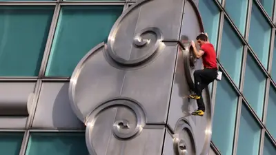 La fase final, considerada la más peligrosa por los organizadores, comenzó al alcanzar la torre superior del edificio, donde los desplomes exigieron toda la fuerza de sus brazos. Desde allí avanzó por los anillos hasta la aguja, rematada por una pequeña esfera metálica suspendida sobre el vacío, donde se hizo un 'selfie' para la posteridad.