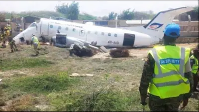 Se puede ver al vuelo de Halla Airlines con 34 personas a bordo saliendo fuera de la pista y estrellándose contra un muro de hormigón después de aterrizar en el aeropuerto Aden Adde de Mogadiscio en Somalia.