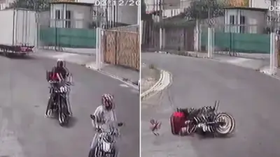 En imágenes de cámara de seguridad, el agente fue abordado y rodeado por tres sospechosos, también en motocicletas.
