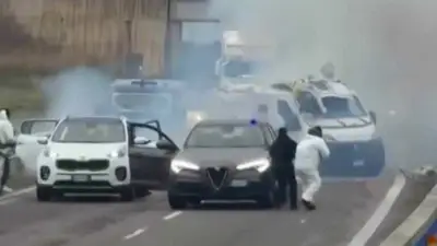 Un comando armado bloqueó una carretera en el sur de Italia, incendió vehículos, simuló un control policial y atacó dos furgones blindados en una operación digna de una película. Dos sospechosos fueron detenidos y otros permanecen prófugos.