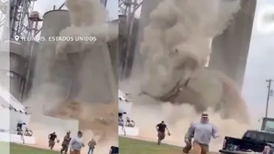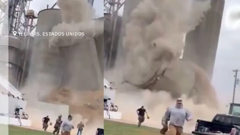 Un silo de granos se derrumbó este miércoles en la ciudad de Martinton, Estados Unidos. Aunque no se reportaron heridos, el incidente causó graves daños en la infraestructura eléctrica, y un video muestra a varias personas corriendo para ponerse a salvo.