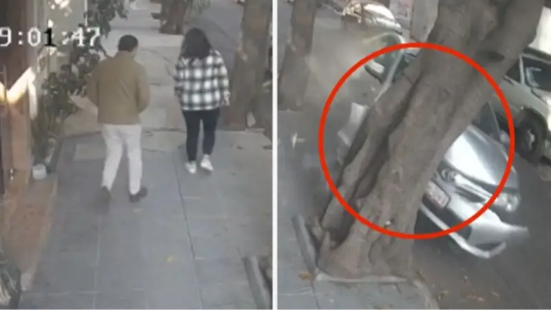 En las imágenes, de poco más de 30 segundos, se observa cómo la pareja sale del edificio, cierra la puerta y continúa su camino por la acera. Minutos después, un automóvil gris aparece a alta velocidad, maniobrando para esquivar baches en la vía. El conductor logra pasar el primero con dificultad, pero al intentar esquivar el segundo, pierde el control del vehículo y termina estrellándose contra un árbol.