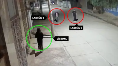 En las imágenes se observa a la víctima caminando sola por la acera cuando, de repente, dos sujetos se acercan rápidamente. La joven intenta escapar, pero uno de ellos la toma del cuello y la inmoviliza, mientras su cómplice la amenaza con un cuchillo para arrebatarle sus pertenencias.