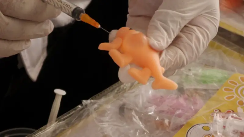 Según la explicación técnica de los funcionarios municipales, el juguete consiste en una masa elástica que debe inflarse introduciendo aire con la jeringa. Sin embargo, el diseño omite advertencias sobre el riesgo que implica que menores manipulen agujas metálicas.
