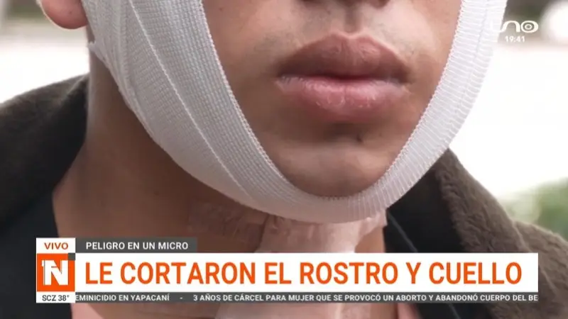 Ulises, un joven de 23 años, fue víctima de un brutal atraco en un micro, sufriendo cortes profundos en el rostro y cuello que requirieron más de 40 puntos de sutura. El incidente ocurrió en el tercer anillo, en la zona del Zoológico de la ciudad de Santa Cruz.