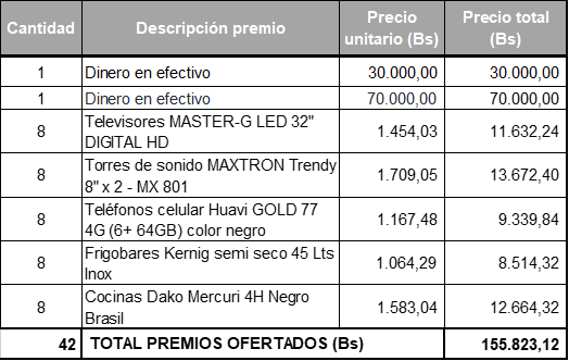 f) PREMIO OFERTADO: Es un único premio de 100.000 bolivianos otorgado al equipo ganador del programa, el premio se entregará en dos cheques uno de Bs 30.000.- para el famoso y otro de Bs 70.000.- para el grupo de baile.