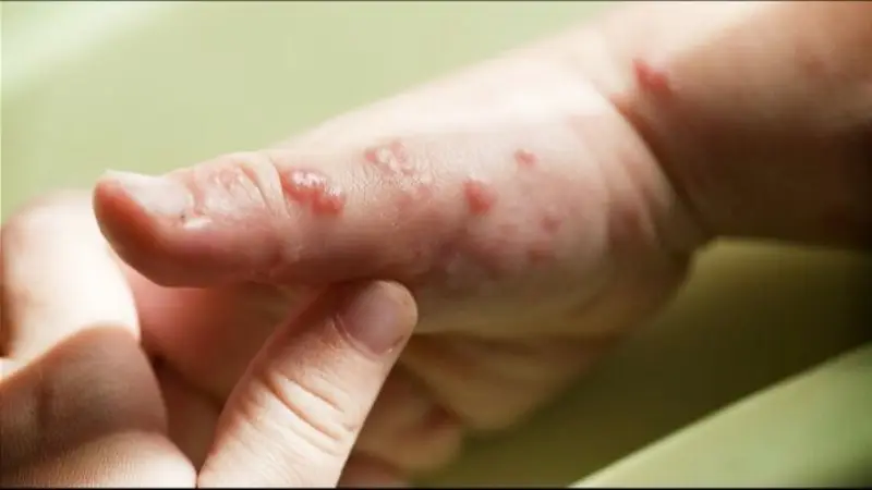 Posteriormente, se presentan ganglios linfáticos inflamados y una erupción cutánea que pasa por etapas de manchas, ampollas y costras, afectando la cara, manos, pies, genitales y boca. En algunos casos también se observa dolor de garganta o tos.