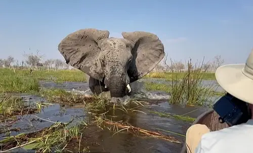 InternacionalElefante furioso vuelca canoa de safari e intenta aplastar a turistaEn medio del caos, el animal pareció ensañarse con una de las turistas, usando su cabeza para empujarla bajo la superficie del agua.PorMilen Saavedra