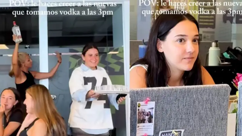 Un video que circula con fuerza en redes sociales ha despertado tanto risas como desconcierto al mostrar una original bienvenida realizada a nuevas empleadas de una oficina. La escena, que ya suma miles de reproducciones, captura el momento exacto en que la rutina laboral se interrumpe por una supuesta "tradición" alcohólica.